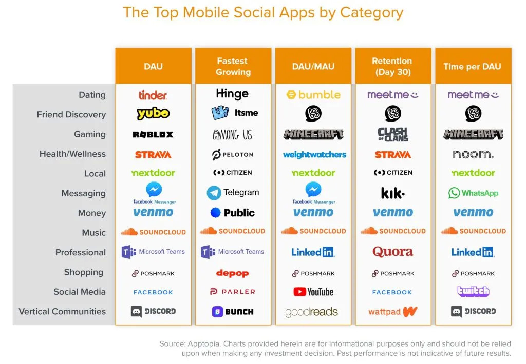 尽管社交媒体巨头们可能已经获得了网络效应,但对增长最快的社交应用进行分类观察,能为下一个爆款应用可能出现的地方提供有趣的信号。
