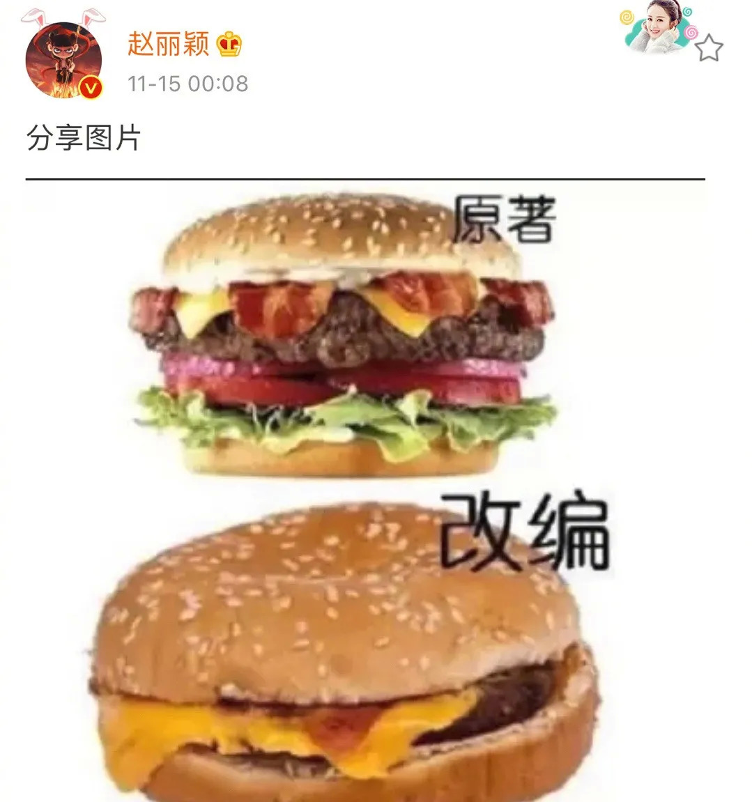 早在《有翡》拍摄期间,赵丽颖就曾在微博发布过一张“汉堡图”,疑似暗指《有翡》对原著的“魔改”。