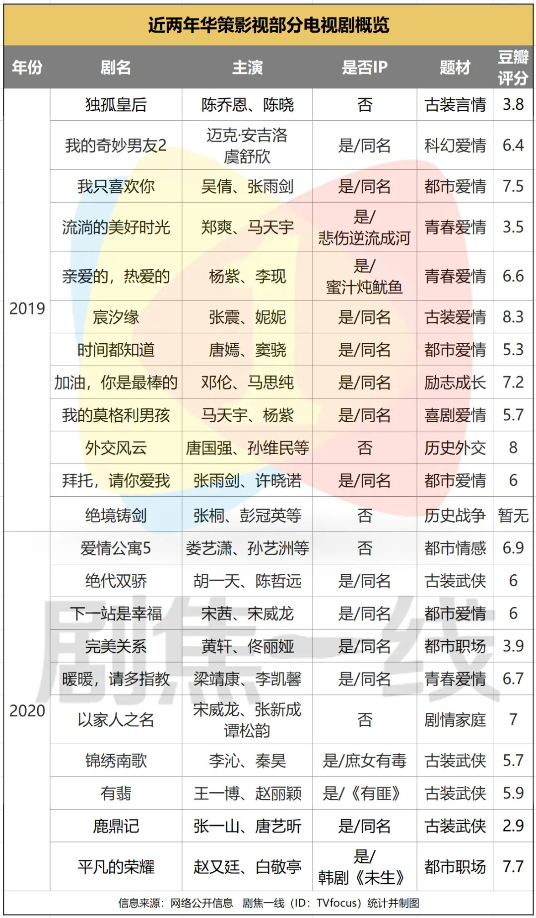 这种发展态势延续至今。据剧焦一线统计,华策影视在近两年播出的剧集中超过一半的剧集都是情感剧。并且,像《完美关系》《锦绣南歌》《有翡》等剧依然是职场、武侠剧下的言情剧。