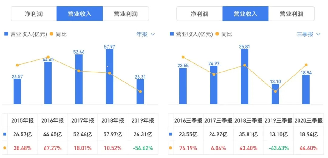 反映到财报数据上,2015年-2018年,华策的营收一直保持上涨态势,其中2016年的增速最快,达到67.27%。而那一年,《亲爱的翻译官》《锦绣未央》《微微一笑很倾城》都是年度热剧。但在之后,华策的年度营收增速逐年降低,2019年,更是骤降54.62%至26.31亿。到了2020年,尽管其营收呈现出上涨态势,但较峰值时的2018年相比,已是几近腰斩。