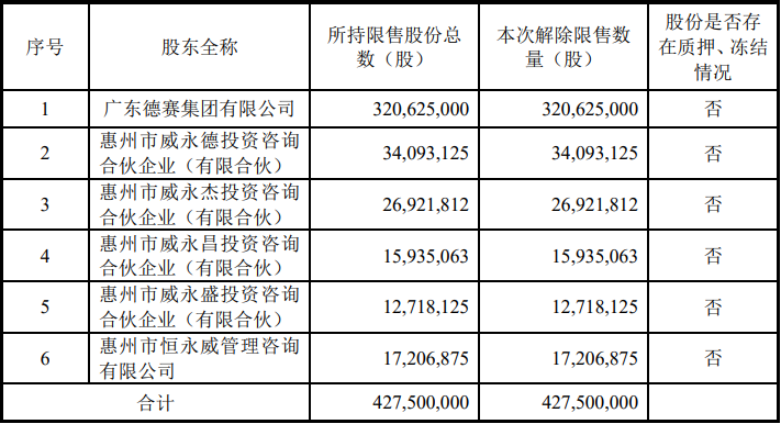三年前上市的德赛西威解禁数量4.28亿股,解禁市值305.24亿元,占总股本比例的77.73%,是解禁前流通盘的3.49倍。