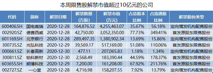 本周国电南瑞(600406.SH)、德赛西威(002920.SZ)、北京银行(601169.SH)三家公司各新增流通市值超过100亿元,且集中在12月28日,这一日A股市场有高达938.95亿市值限售股解禁。此外近期股价大跌的朗博科技(603655.SH)本周也将迎巨量首发限售股解禁。