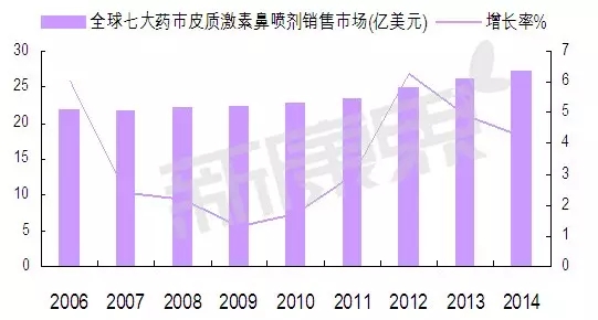据英国GlobalData咨询研究公司数据显示,2014年全球过敏性鼻炎治疗市场规模为72亿美元,在OTC竞争下,增长一直处于缓慢态势。全球七大医药市场糖皮质激素鼻喷雾剂销售额占据了总体市场的38%,市场销售额为20.48亿美元,且同比上一年下滑了13.77%。