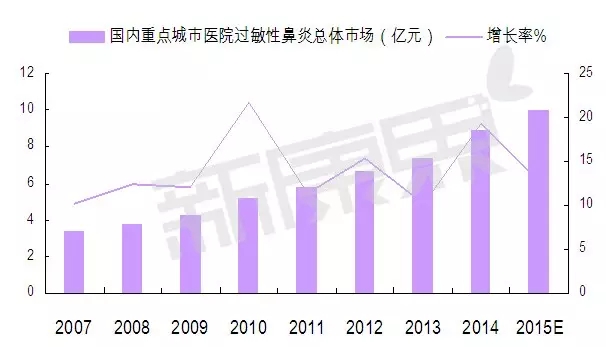 我国过敏性鼻炎治疗药物市场由处方药和OTC组成,包括口服或鼻用抗组胺药、鼻用皮质类固醇、白三烯受体拮抗剂和中成药四大类药物。2014年国内重点城市公立医院联网统计数据表明,过敏性鼻炎用药总额达到了8.93亿元,同比上一年增长了19.33%。