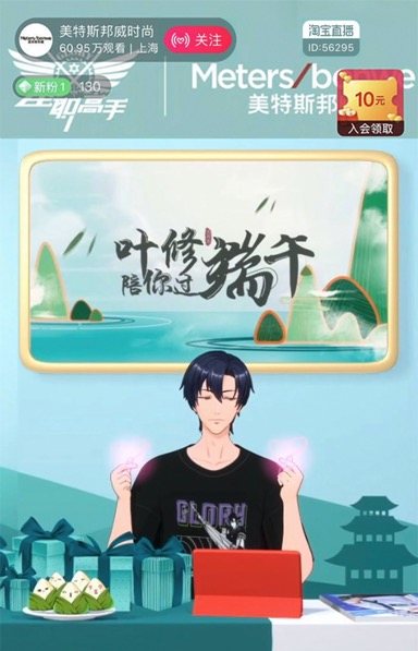 有别于其他品牌尝试新媒介的传统打法,这次美特斯邦威采用了虚拟现实技术进行直播,将《全职高手》的主角叶修带入品牌的直播间。尽管是带货主题,但主播和叶修(虚拟人物)跨次元同屏互动,与粉丝寒暄问答、介绍产品设计理念及游戏互动。
