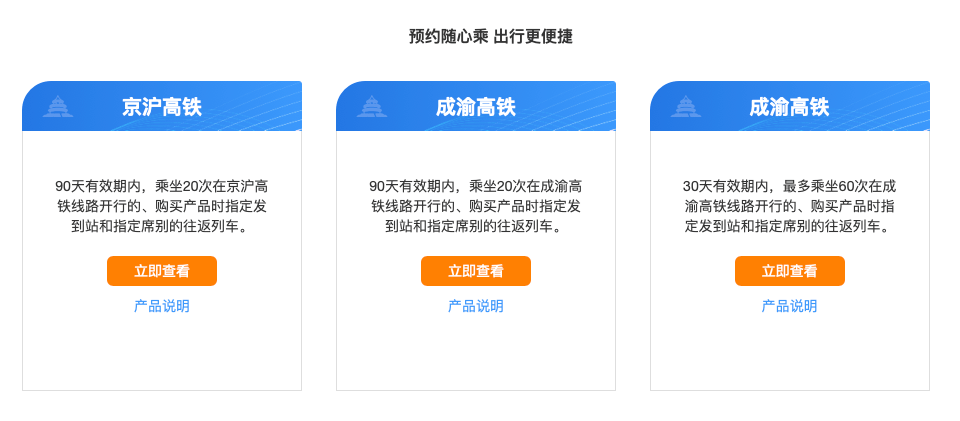 在12306的网站,我们可以找到「记次票」产品的页面,现阶段共上线了三个产品,分别为90天/20次的京沪高铁记次票、90天/20次的成渝高铁记次票与30天/60次的成渝高铁记次票。但和航空公司的随心飞不同,记次票需要在购买时就选定发到站,没有航司那么「随心」;随着发到站的变化,产品的价格也会有相应的浮动。