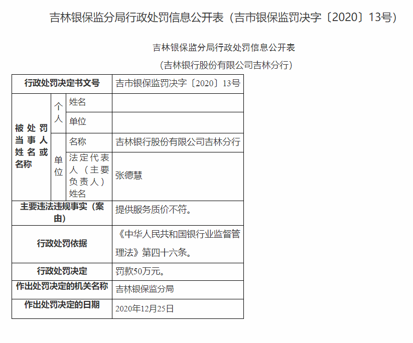 12月30日消息,据吉林银保监分局行政处罚信息公开表(吉市银保监罚决字〔2020〕13号),吉林银行股份有限公司吉林分行因“提供服务质价不符”被罚50万元。