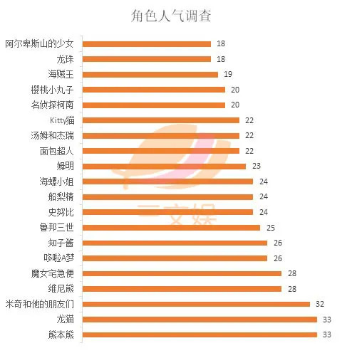 从该调查结果中可以看出,入榜前20位的人气角色中有11个都是日本的动画或漫画作品,占比高达55%,非日本作品的人气角色在动画作品中占比25%,以迪士尼出品居多。