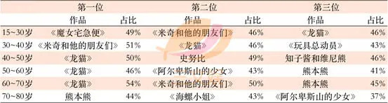再看女性方面。15~30岁最喜爱的角色为《魔女宅急便》49%,其次是《米奇和他的朋友们》46%、龙猫46%。