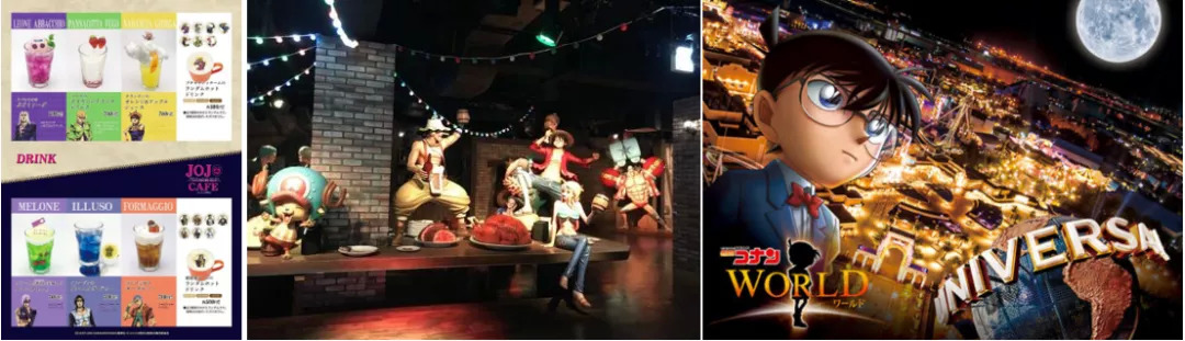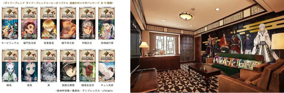 如《鬼灭之刃》代言的咖啡、《刀剑乱舞》联动的主题酒店、《JOJO》主题咖啡店、东京铁塔《海贼王》主题乐园、环球影城《名侦探柯南》主题馆等等。海内外的许多分粉丝为这些驰名海内外的动漫、游戏作品慕名而来并进行消费,为日本角色经济的发展添砖加瓦。