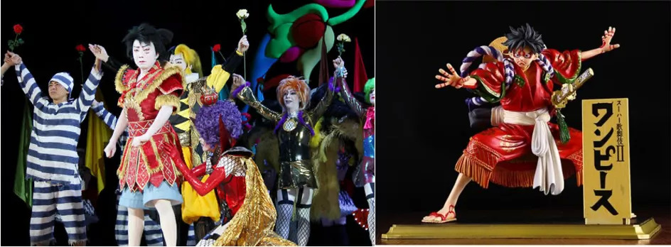 而《海贼王》另辟蹊径,以日本传统艺术——歌舞伎相结合进行演绎,在2015~2018年期间进行演出。海贼王歌舞伎版的周边产品也随之热销,主人公路飞的模型线上销售价格高达4万日元,依旧吸引了众多粉丝下单购买。