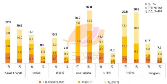 有趣的是,Line Friends和冒险岛在没有子女的人群中认知度较高而Kakao Friends、宝露露、碰碰狐、Pengsoo、可可猴则是在育有子女的人群中认知度较高。而且如宝露露、碰碰狐、可可猴这样的幼儿动画或内容角色在日本的认知度,有子女的人普遍比无子女的人高出许多。而Pengsoo作为“知名”油管博主2019年末正式进军日本的线上媒体,而逐渐提高了其曝光度。而且据悉,在日本Pengsoo被分类为“治愈系吉祥物”,从而提高了其接受度。