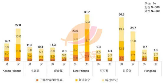从性别角度来看,Kakao Friends和Line Friends普遍在女性中认知度较高,而其余5个角色则是在男性中的认知度较高。