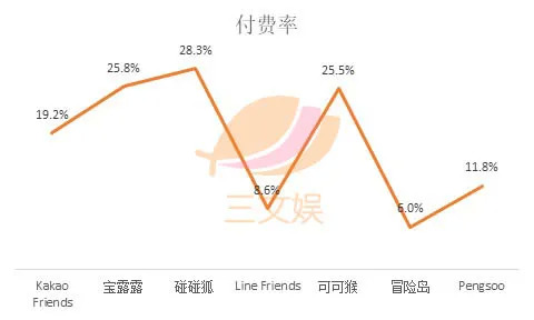 其中付费订阅率最高的角色为可可猴25.5%,其次是碰碰狐18.9%、宝露露18.2%、Pengsoo11.8%、Line Friends8.6%、冒险岛6.0%。