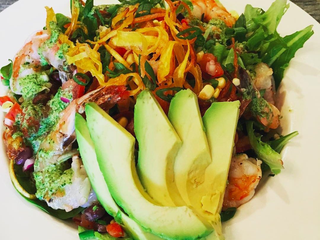这就是餐厅的圣达菲沙拉(Santa Fe salad),内含有机蔬菜、牛油果、玉米、番茄沙沙、烤虾及车前草丝,用料丰富: