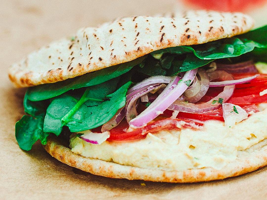Grown同时也供应这款地中海特色卷,里头包裹着鹰嘴豆泥、藜麦塔博勒沙拉、有机小菠菜、腌洋葱、西红柿及香草酸奶抹酱: