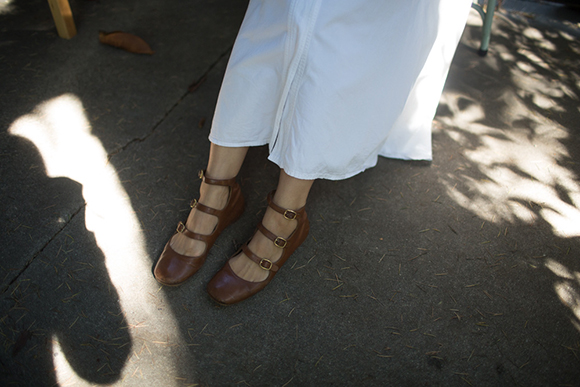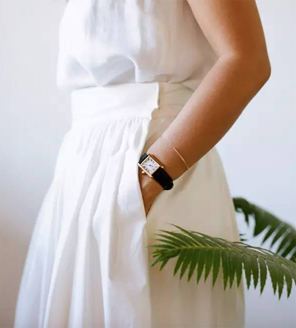 白色直筒牛仔裤,Jesse Kamm的无袖纽扣领衬衫,Acne的背心(Muscle Tee),Smock的迷笛裙,Grace Lee珍珠戒指和Catier手表。