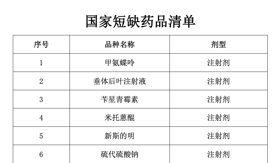 国家短缺药品清单共有6个品种,分别为甲氨蝶呤注射剂、垂体后叶注射液、苄星青霉素注射剂、米托蒽醌注射剂、新斯的明注射剂、硫代硫酸钠注射。