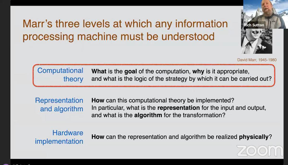 他引用了神经科学家David Marr三个处理级别的概念:计算理论、表征和算法以及硬件设备,提出当前AI届中并没有计算理论,梯度下降等可以被称为AI的方法,但远称不上理论。