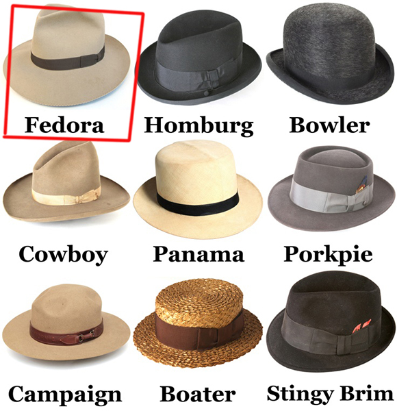 Fedora,即浅顶软呢男帽,顶部为前尖后圆的水滴凹陷,帽沿较为宽阔。由于柔软的材质,帽沿和帽顶都能被随意地捏出造型。Fedora 是在20世纪40年代相当流行的男帽,在当时的好莱坞电影中常常看到它塑造冷库不羁的形象:芝加哥黑帮、私人侦探、报纸记者、当然还有那些漫画英雄。