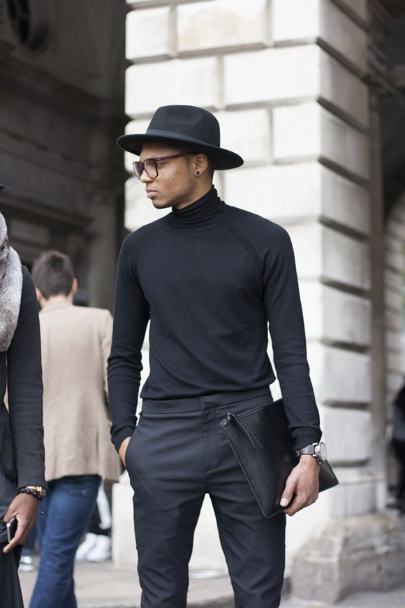 黑灰配色自然有着老熟的艺术气质。多一件高领毛衫,除了保暖舒适,更是文艺暖男的必备品,而宽沿的 fedora 帽子与高领肃然配搭,有着一点牧师的神秘气质。