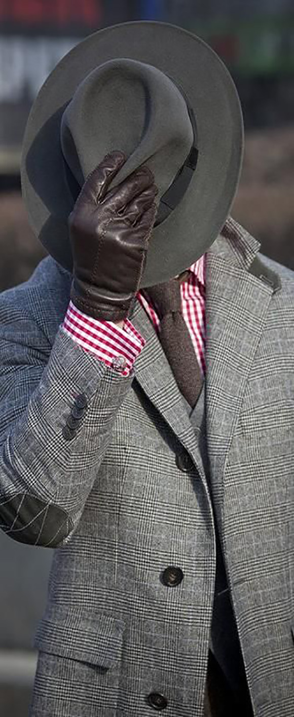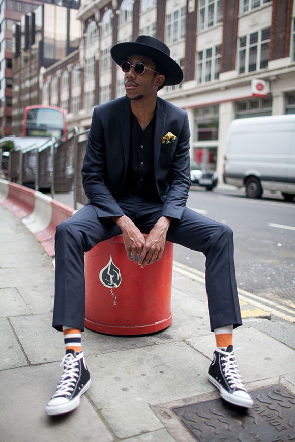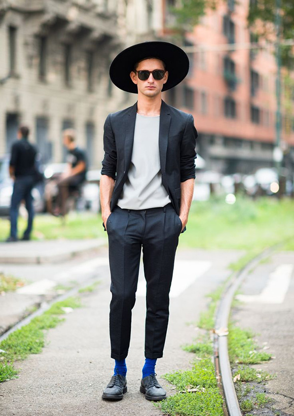 西装一定注重瘦版、短款、露脚踝三个元素,这样与 fedora 帽子搭配才有一定的戏剧性。当然,精彩的彩色袜子让整身装扮不至于那么宗教气息。