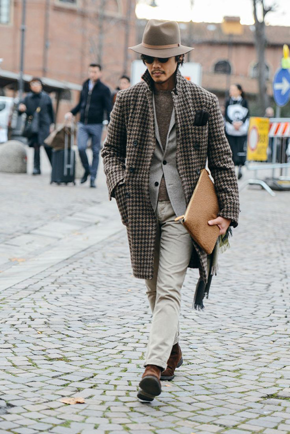 此种搭配偏于正统,注重层叠质感,内搭西装与外在同色的大衣叠穿,讲究的是一种颜色的多层次渗透。而最讲究的,是 fedora 帽子颜色要与服装整体颜色一致。