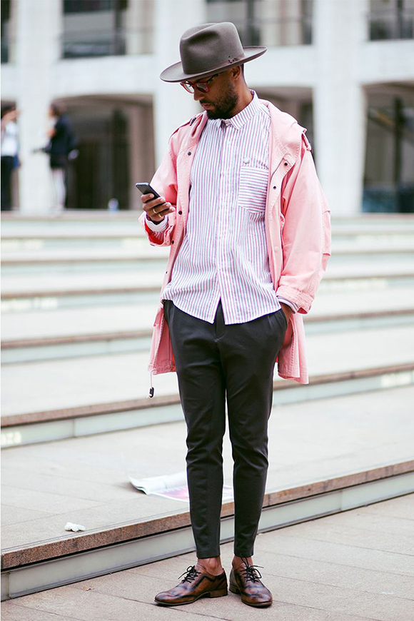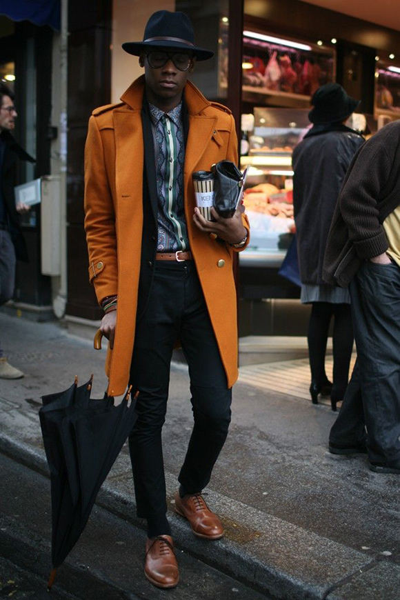 此种组合搭配,强调的是颜色,稳重鲜亮。如中长款的亮色大衣,搭配特色格子衬衣,让搭配伴随一点活泼性格。重点的 fedora 帽子,更会让 look 焕发一点新潮活力。