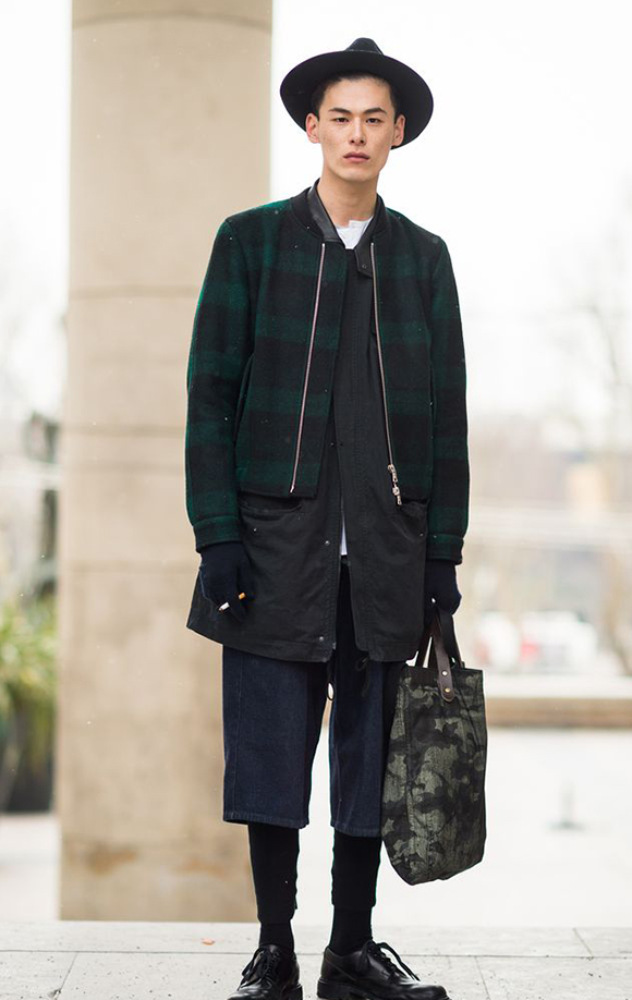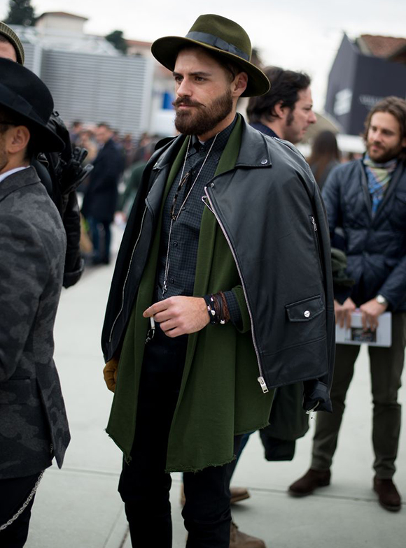 主要目的就是就是要多层次穿着。无论大披肩在内还是在外,让人数不清楚你穿了几件才是专家。夹克的短,与衬衣的长互相对比,fedora 帽子的最终配搭,让你的风格潮而不怪。