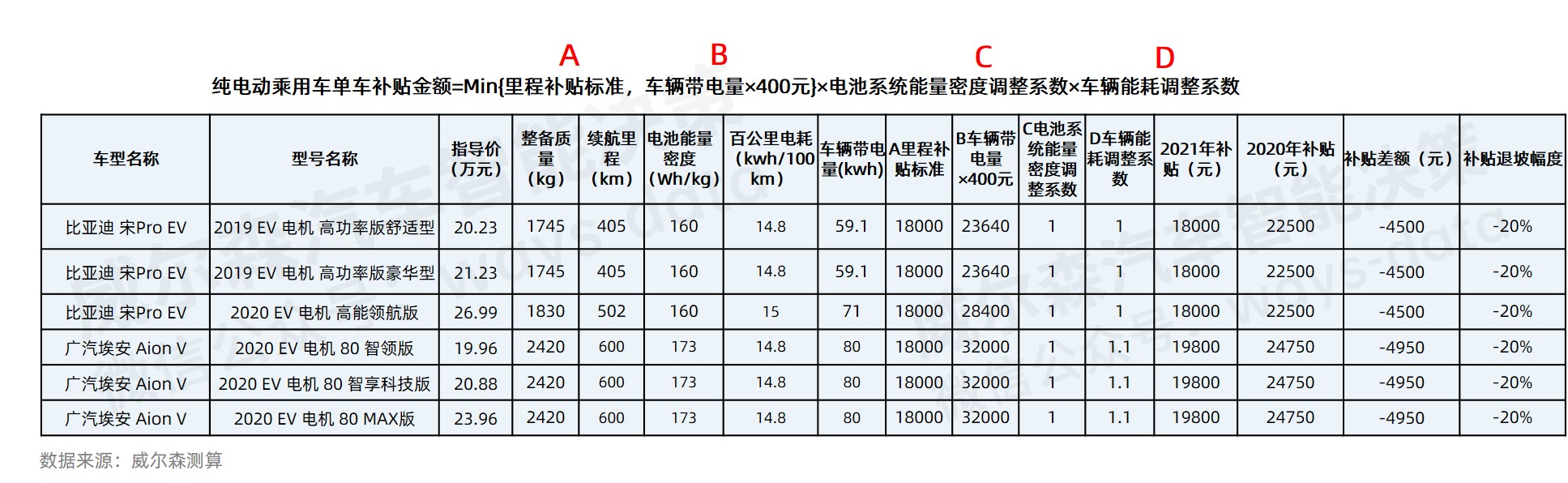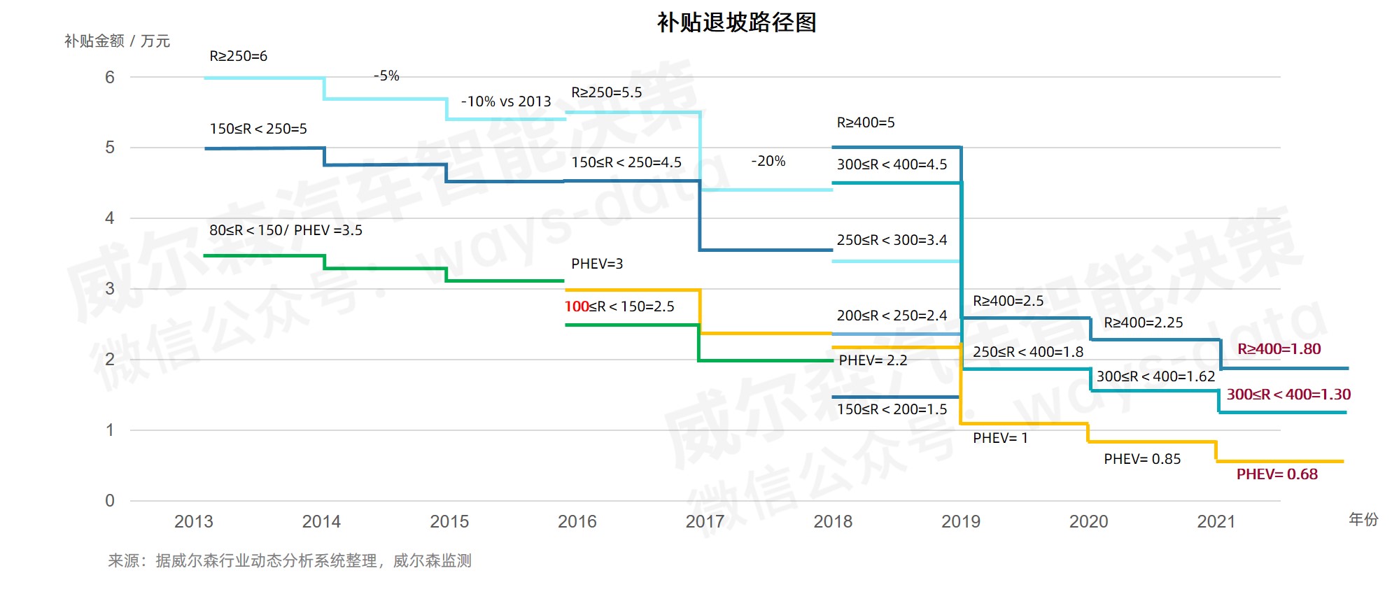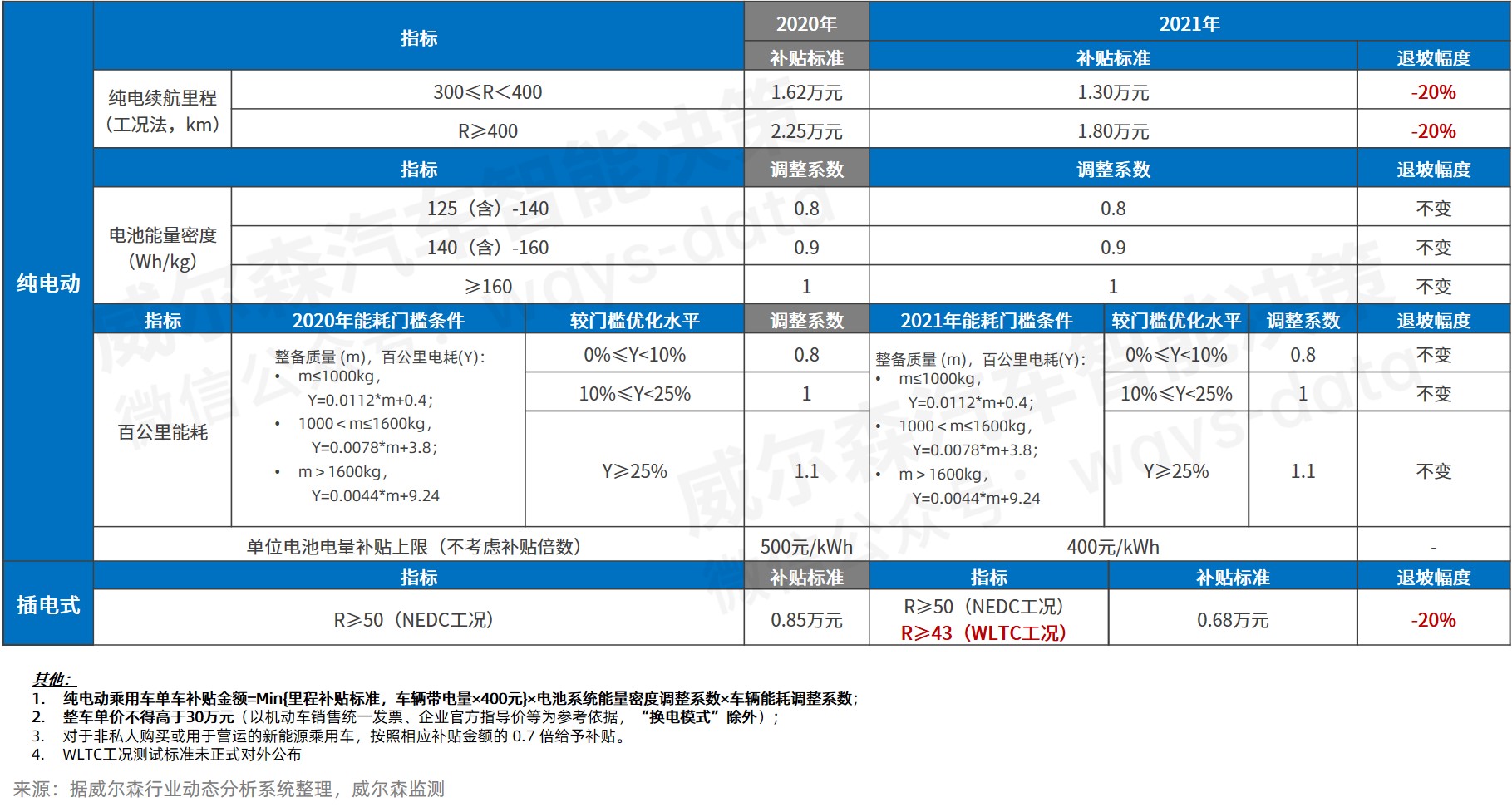 BEV续航里程补贴门槛不变,补贴幅度下降20%,PHEV增加WLTC测试工况,补贴幅度同样下降20%。