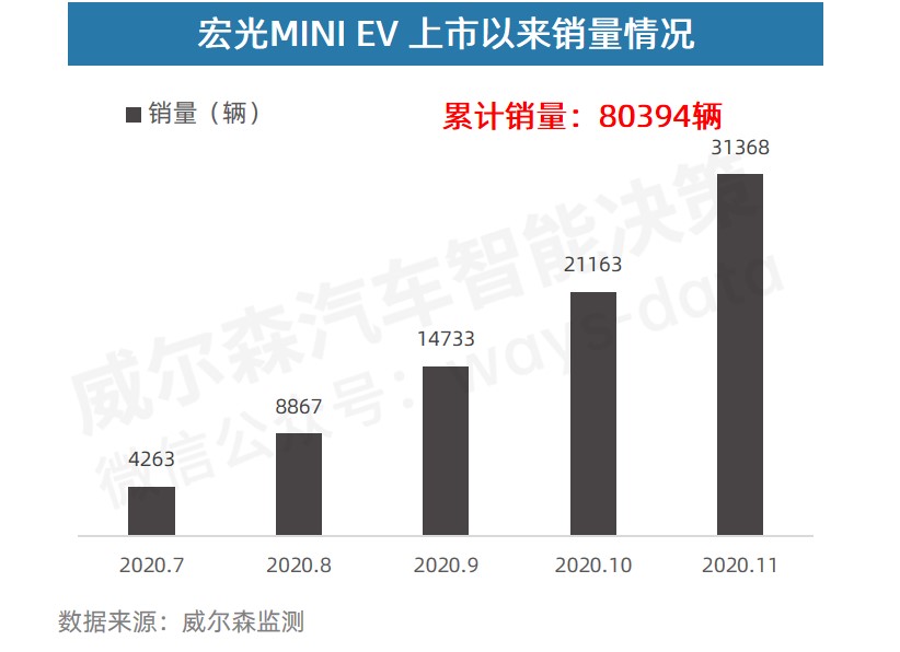 其中,值得一提的是,宏光MINI EV作为参与“新能源汽车下乡”活动的车型,虽然续航里程达不到国家的补贴标准,但截至2020年11月,宏光MINI EV累计销量已达8万辆,成为国内新能源车型爆款,强势突围新能源市场。