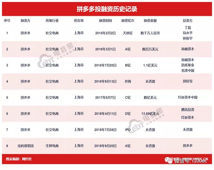 据网经社“电数宝”(DATA.100EC.CN)电商大数据库监测数据显示,拼多多共获得7轮数十亿美元融资,投资方包括红杉资本、拼好货、高榕资本、凯辉资本、光速中国等,具体融资情况为:
