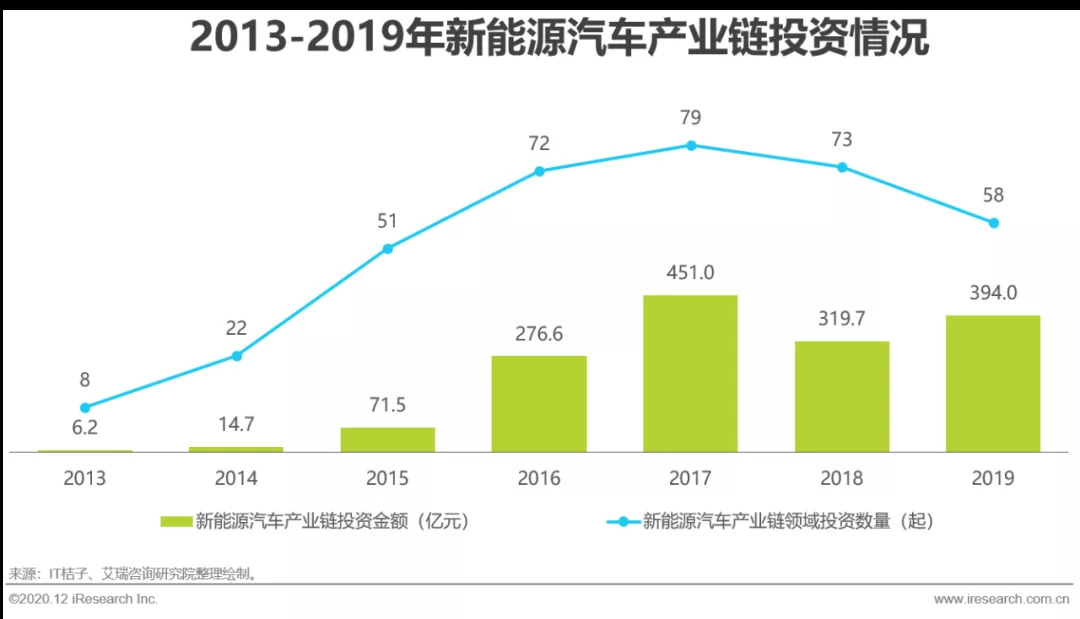 自2013年新能源概念被给予更多关注后,相关投资事件与投资金额成倍增加,在2017年达到顶峰。相比2018年,2019年投资数量减少但金额增多,反映了投资方更加倾向少量成长性高的优质企业;缺少资金支持的企业逐渐淘汰,行业洗牌进入白热化阶段。新能源汽车基本面呈上扬态势,社会资本、国有资本和互联网巨头纷纷布局,展现了多方资本对新能源汽车的看好。