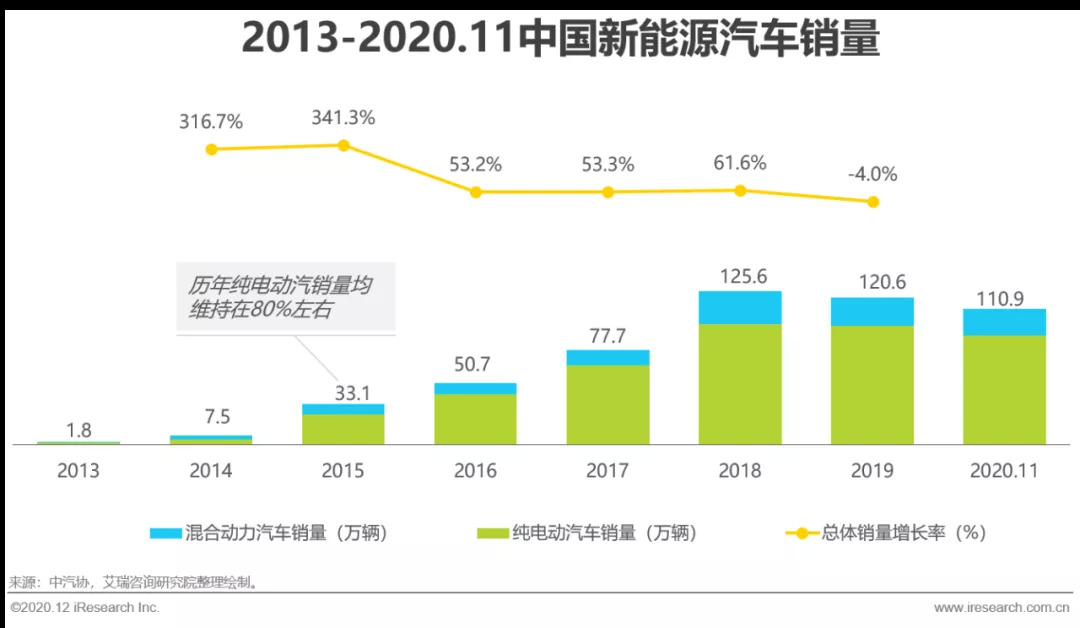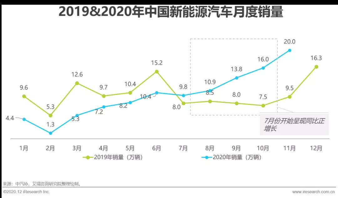 新能源汽车行业较易受到政策影响而产生较大波动,受补贴退坡影响,2019年新能源汽车销量同比下降4%。2019年下半年国五切换国六也打破了原有的燃油车价格体系,提前透支汽车消费,导致下半年销量下滑明显。但整体而言其韧性依然强大,12月销量大幅回暖,整体销量仍然超过120万辆。2020年受疫情影响,上半年新车销量经历断崖式下降,但从3月开始快速回暖,7月份便迎来了首次同比正增长。在此之后,9月份销量13.8万,刷新了9月新能源汽车销量的历史记录;11月销量也突破了20万大关,得益于政府对新能源汽车消费的支持和企业的有力举措。艾瑞预计,2020年新能源汽车销量将在130万左右。