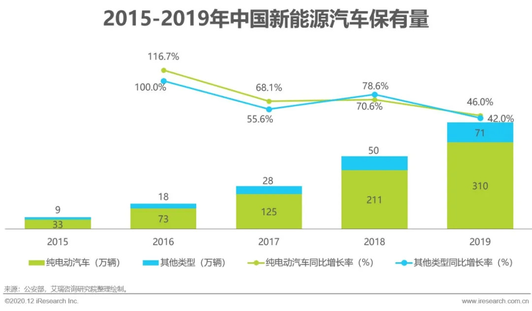 中国新能源汽车行业在过去几年内经历了飞速的发展,正在从萌芽期向成长期迈进,其保有量在5年间增长了9倍有余。由于我国坚持的纯电驱动战略取向,纯电动汽车在保有量当中占有较大比重,2019年纯电动汽车保有量达到310万,占比81.4%。当前,由于科技和产业变革,新能源汽车已经成为汽车产业转型升级的中坚力量,新能源汽车行业也迎来了前所未有的发展机遇。