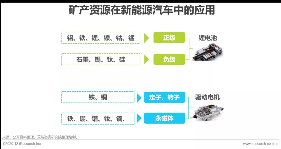 稀土永磁材料是指稀土元素RE(铈Sm、钕Nd、钐Sm)和过渡金属元素TM(铁Fe,钴Co)形成的合金经一定的工艺制成的永磁材料,是对电机性能、效率提升较为明显的重要基础材料。2019年中国稀土矿资源储备量4400万吨,占全球资源比重的36.7%。电池级碳酸锂、钴、镍、铂、镝等为制作电池正负极和稀土永磁电机的关键性矿产资源。稀土永磁驱动电机具有较宽的弱磁调速范围、高功率密度比、高效率、高可靠性等优势,能够有效地降低新能源汽车的重量和提高其效率,需求难以被替代,钕铁硼永磁体是目前新能源汽车驱动电机中应用最广泛的材料。