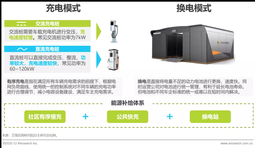 目前,新能源汽车能源补给可以通过充电和换电两种模式,充电又可以分为交流充电和直流充电。有序充电模式可以在满足充电需求的情况下做到削峰填谷,减少对电容的需求,减轻电网压力。同时,换电模式也在逐渐发力,在近期的国新办新闻发布会当中,工信部表示鼓励企业研发新型充电和换电技术,探索车电分离的模式应用,换电模式有望迎来快速发展阶段。
