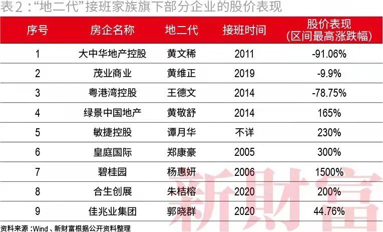 新财富对完成管理接班且有公开数据的部分房地产家族情况进行考察,结果显示“地二代”接班后,公司普遍表现平淡(表2)。9家上市房企中,“地二代”接班至今股价增长为负的3家,占1/3;股价上涨但平均增幅较小者有3家,也占1/3;剩余3家“地二代”的守业能力或需待更长时间的考察。