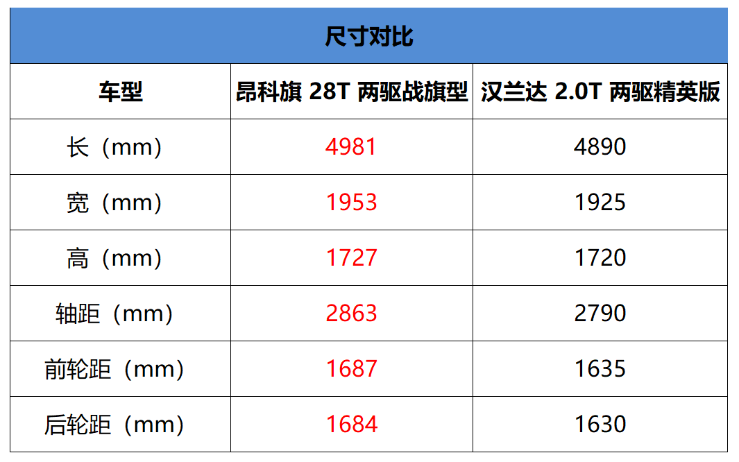 实际上昂科旗和汉兰达本不是直接竞品的关系,除了价格重合,同样提供三排七座布局,从尺寸来说前者属于中大型SUV身段;而后者还停留在中型SUV范畴。昂科旗的整体尺寸比汉兰达大上一圈,二者在诞生之初本不是同一个级别的选手。