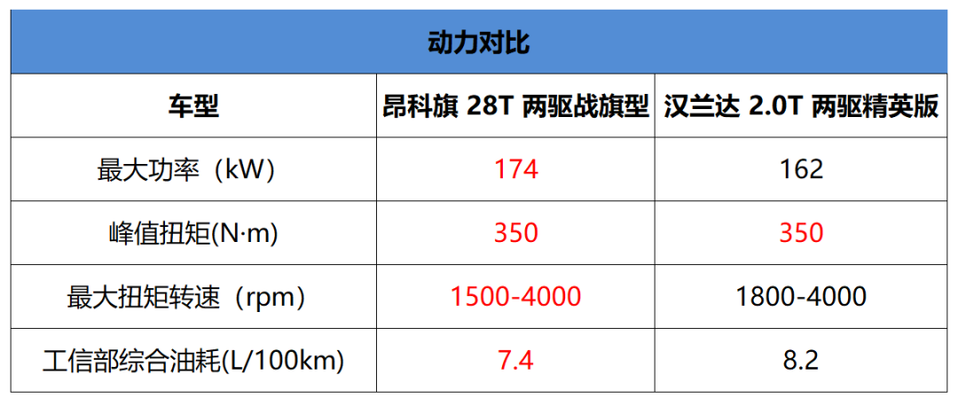 大七座需要考虑家庭满员出行,最怕的就是遇到小马拉大车的尴尬。两款车型都使用2.0T发动机,但从两者的动力对比表中能看到,昂科旗在最大马力方面略胜一筹,而最大扭矩方面两者打个平手。