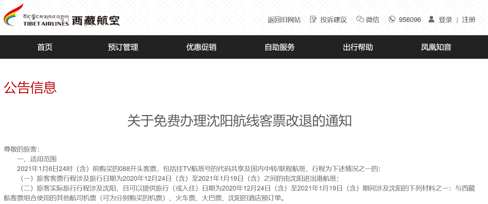 1月8日,西藏航空发布《关于免费办理沈阳航线客票改退的通知》,退改适用范围为2021年1月6日24时(含)前购买的088开头客票,包括挂TV航班号的代码共享及国内中转/联程航班,行程为下述情况之一的: