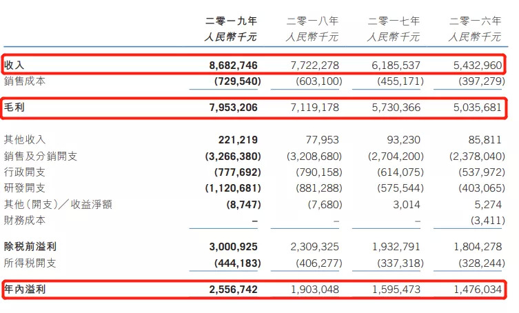 毛利润率连续四年超过91%,非常稳定。2019年净利润率接近30%。