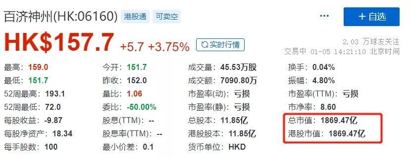 2018年8月,百济神州在港交所上市,成为港股上市的第二家未有盈利的生物科技公司。2019年7月,百济神州“甩”掉B标。目前市值1869亿港元,相较于108港元/股的发行价,单股股价增长46%。