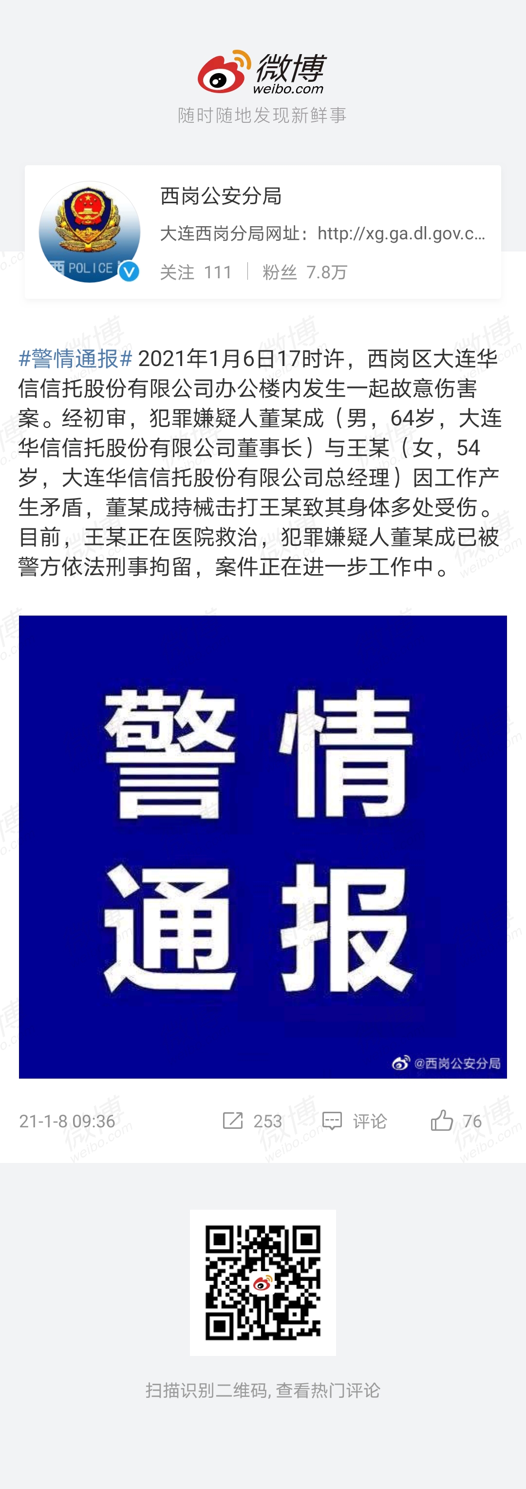 1月8日上午,大连市西岗公安分局通过官方微博发布警情通报称,2021年1月6日17时许,西岗区大连华信信托股份有限公司办公楼内发生一起故意伤害案。经初审,犯罪嫌疑人董某成(男,64岁,大连华信信托股份有限公司董事长)与王某(女,54岁,大连华信信托股份有限公司总经理)因工作产生矛盾,董某成持械击打王某致其身体多处受伤。目前,王某正在医院救治,犯罪嫌疑人董某成已被警方依法刑事拘留,案件正在进一步工作中。