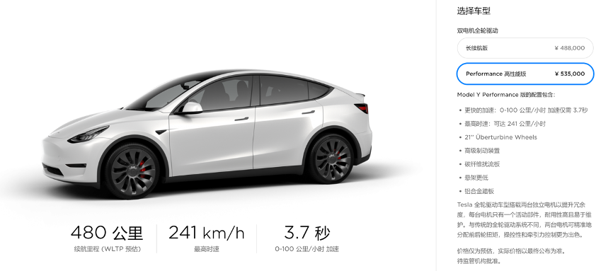 根据目前从特斯拉中国官网得到的消息,国产特斯拉Model Y现已正式上市,其中Model Y长续航版的起售价为33.99万元,Model Y Performance高性能版的起售价为36.99万元。而就在2020年8月,特斯拉官网公布的预售价格为48.8万、53.5万元,此次起售价比之前分别下调了14.81万元、16.51万元。