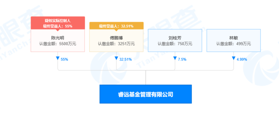 天眼查APP显示,睿远基金目前的股权结构是,陈光明出资5500万元,持有55%股权;傅鹏博出资3251万元,持有32.51%股权;刘桂芳出资750万元,持有7.5%股权;林敏出资499万元,持有4.99%股权。