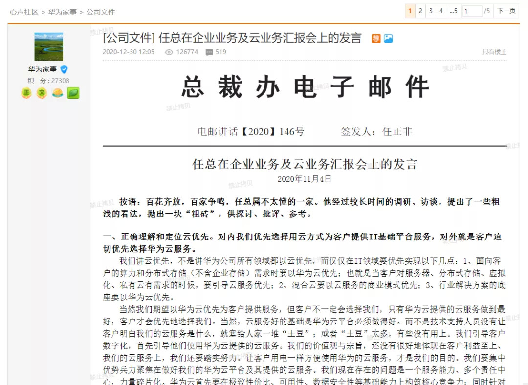 《任总在企业业务及云业务汇报会上的发言》,图源华为心声社区