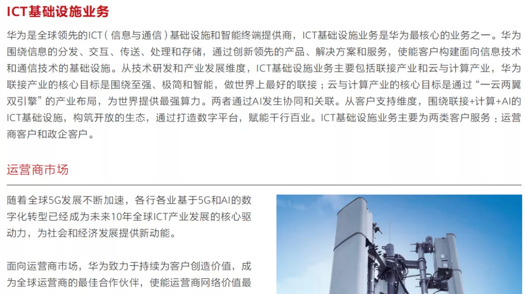 根据华为2019年年报介绍,“ICT基础设施业务主要包括联接产业和云与计算产业,华为联接产业的核心目标是围绕至强、极简和智能,做世界上最好的联接;云与计算产业的核心目标是通过‘一云两翼双引擎’的产业布局,为世界提供最强算力。”