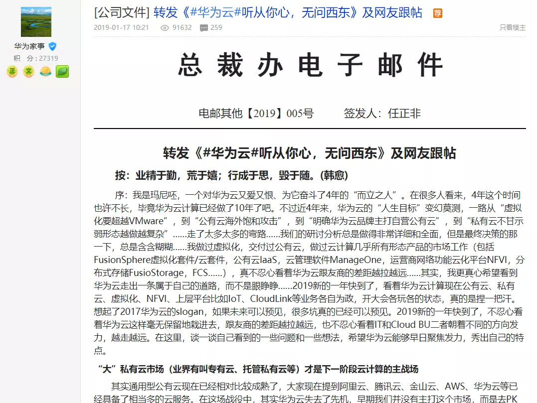 在2019年1月,针对华为云的问题,就有过一次集中的反馈。当时,华为一位内部员工写了一份万字书——《#华为云#听从你心,无问西东》并获得了任正非的转发。