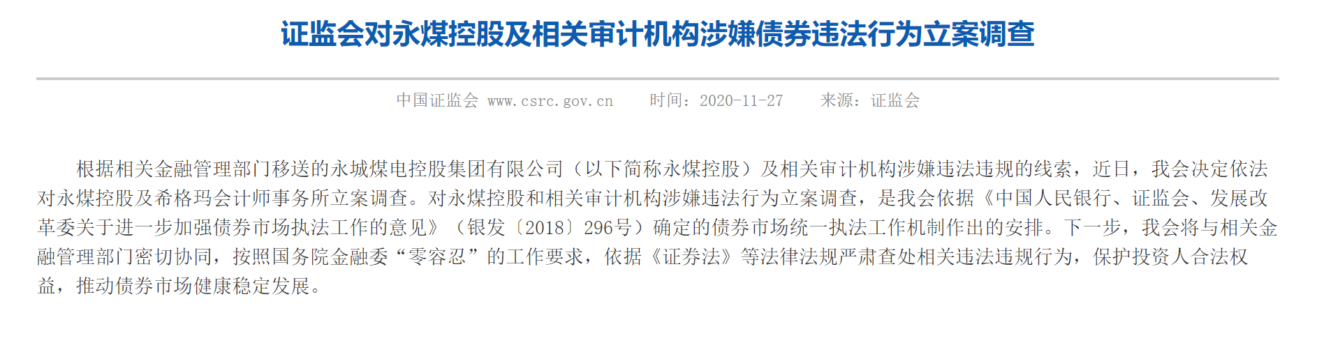 那么希格玛涉及了什么事?从证监会网站上可以看到,2020年11月27日,证监会公告对永煤控股及相关审计机构涉嫌债券违法行为立案调查,其中包括西格玛会计师事务所。